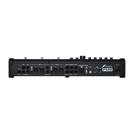 Fractal FM 9 menawarkan sistem input dan output yang sangat fleksibel. Input analog mencakup satu input instrumen 1/4 inci dengan teknologi “Secret Sauce”. Dua pasang input stereo balanced 1/4 inci tersedia sebagai aux input atau return.