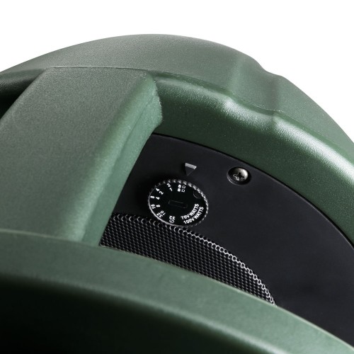 Secara visual, speaker ini tampil dengan warna army green yang khas. Warna tersebut bukan sekadar estetika. Pilihan warna membantu menyamarkan perangkat di area luar ruangan seperti taman, dinding eksterior, atau area publik terbuka.