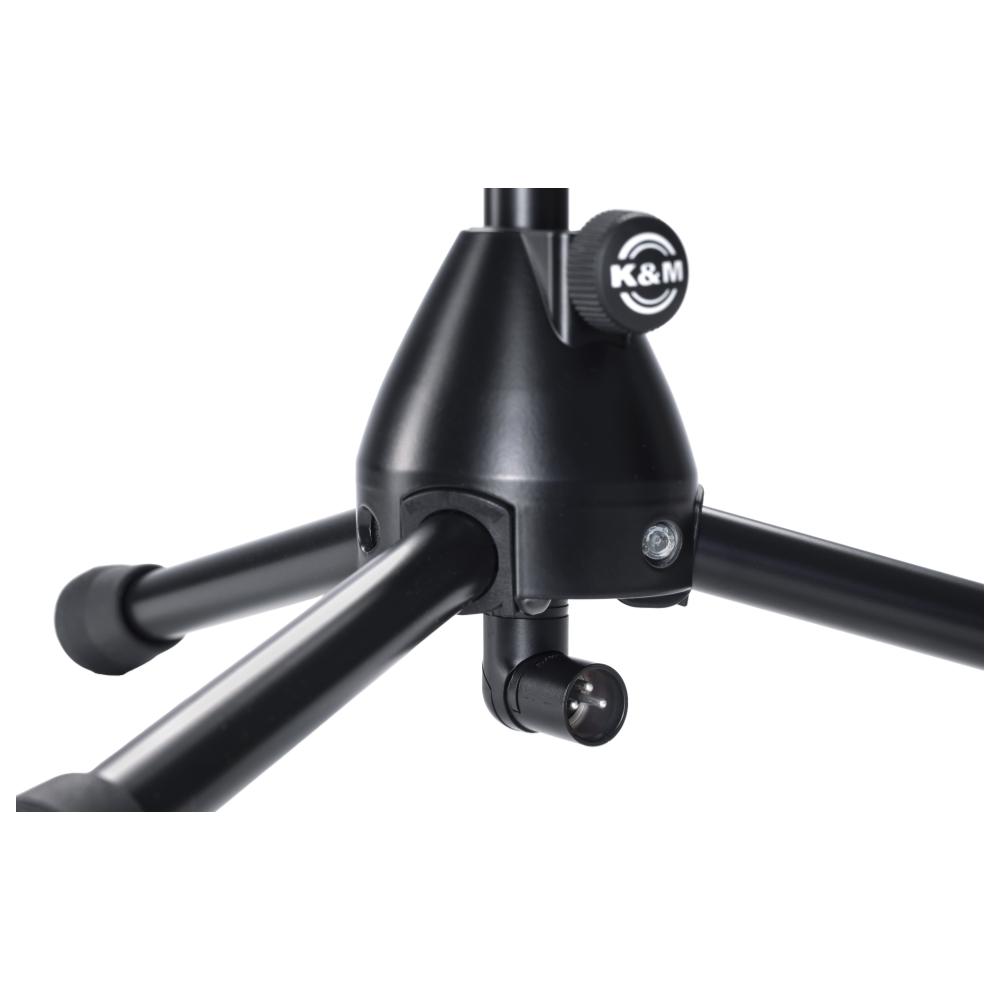 Professional stand with wired XLR connections and additional gooseneck. This premium stand allows the microphone to be connected directly to the stand without a microphone clamp or external cable. There is an angle plug 3-pin XLR connector at the lower end of the tube for cable connection. High-quality digital audio cables are built into both the microphone stand and the gooseneck. These are drawn in, soldered and tested by hand at the KLOTZ AIS factory in Germany. The powder-coated stand has a height of 1,165 mm and can be extended to 1,520 mm with the included gooseneck. The robust, short full metal feet with impact sound absorbing foot caps ensure an excellent, space-saving positioning and are simply folded away for transportation.